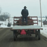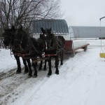 With icy road conditions, this was one of those days when it was wise to have at least three horses hitched, and they were. Pulling a third of the load instead of half allowed them to be a little more confident of the footing.