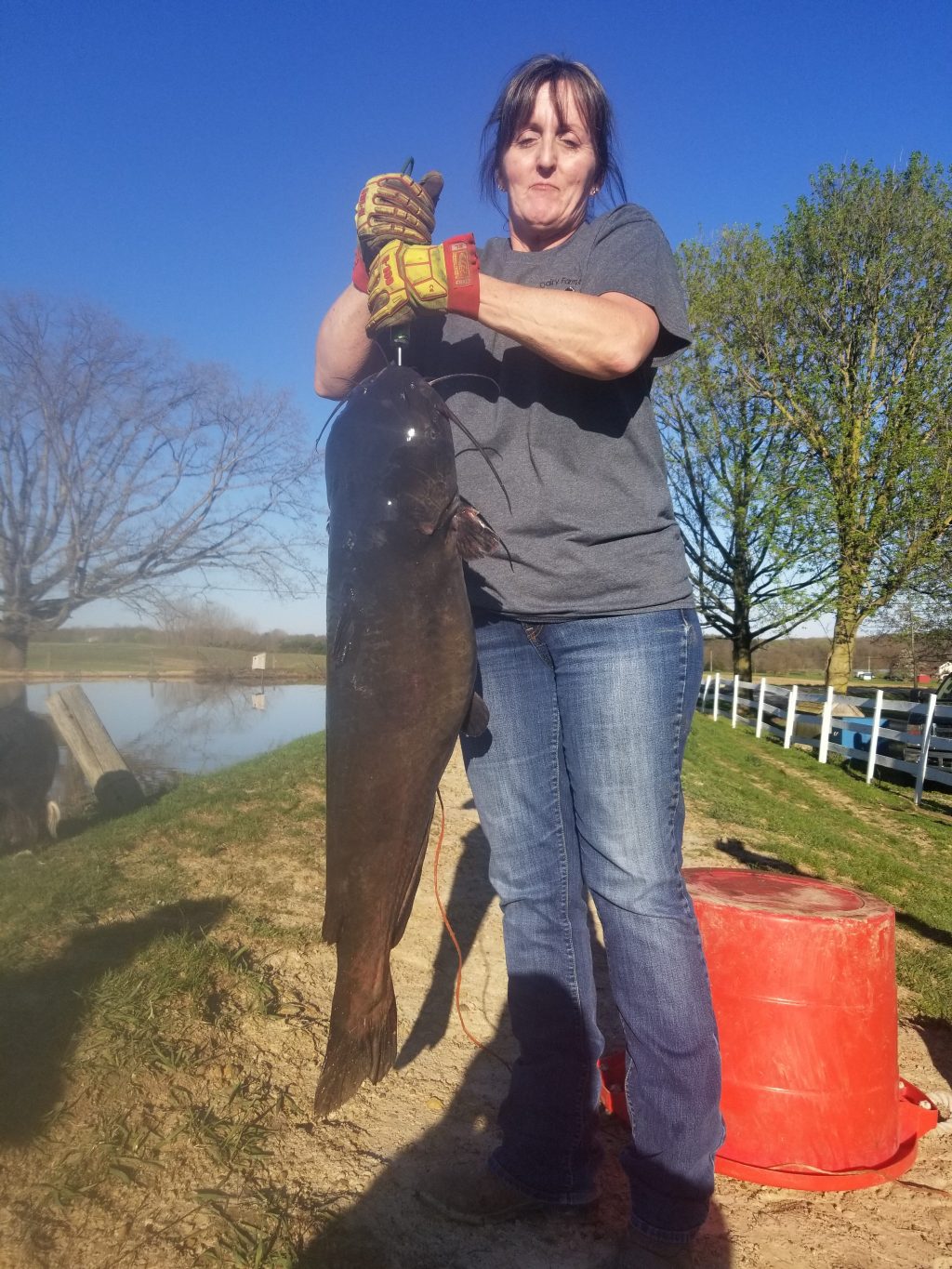 Megan Neville caught a 40-inch channel catfish in a farm pond near Lisbon, Ohio on April 22, 2019.