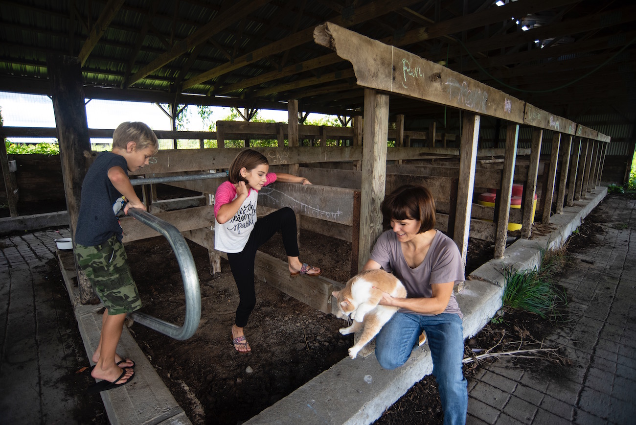 Julie Prentice sits with her kids, Daniel and Gina, who holds a cat named Cashew, in their old cow barn. (Lucy Schaly photo)