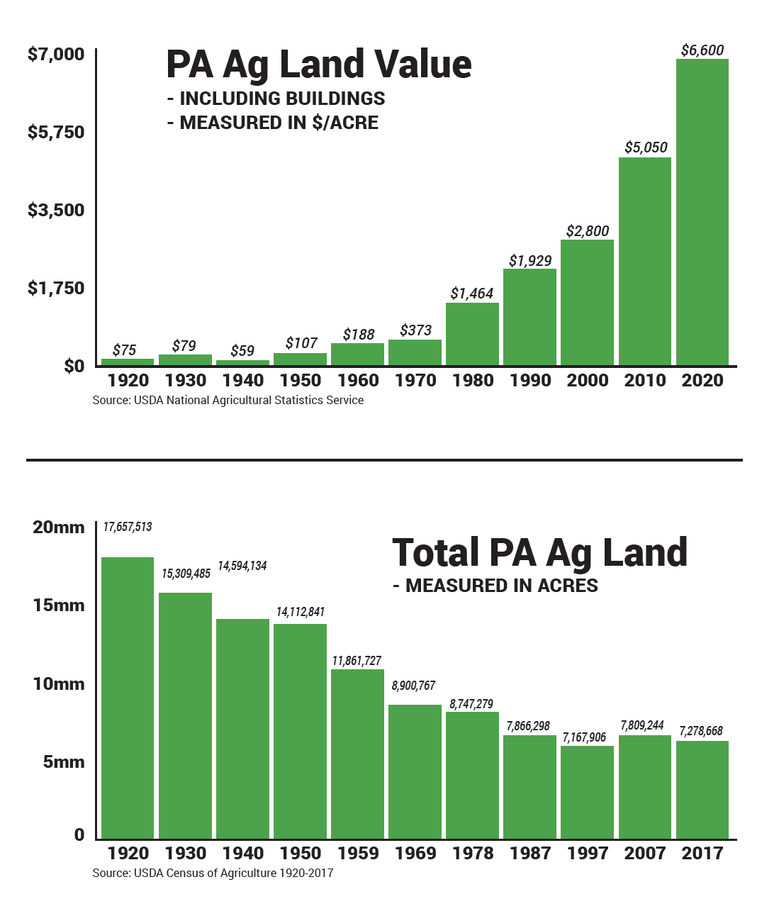 The price of land across the country has crept up over the years. The average price per acre for a farm in 2020 nationwide was $3,160. The price was significantly higher in Pennsylvania and Ohio. The average price for a farm in Pennsylvania is $6,600 per acre. In Ohio, it’s about $6,350 per acre.
