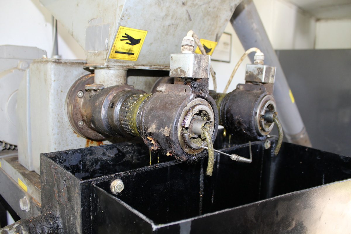 The seeds dispense into the press by gravity and the pressed oil is collected below in a liquids container. At the same time, the pellet-like solids are carried away on a conveyor belt. The oil can then be filtered or left to settle, to remove foreign materials.
