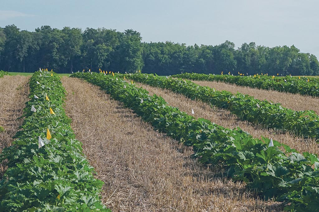 After termination, squash varieties are planted directly into the residue. Some growers use similar systems, planting early maturing pumpkin varieties after a wheat harvest.
