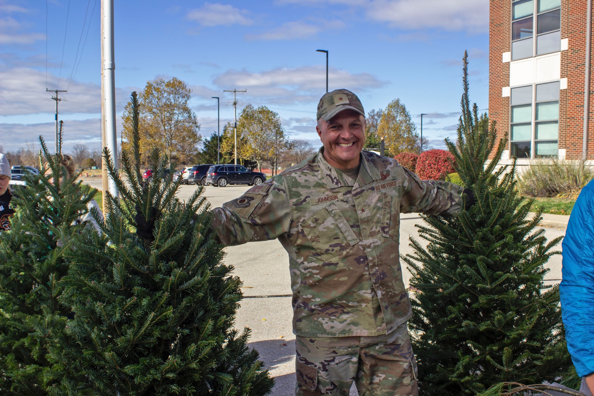 Brig. Gen. David Johnson, Ohio Air National Guard chief of staff, holds two trees ready to be packaged and sent abroad (Paul Rowley Photo).