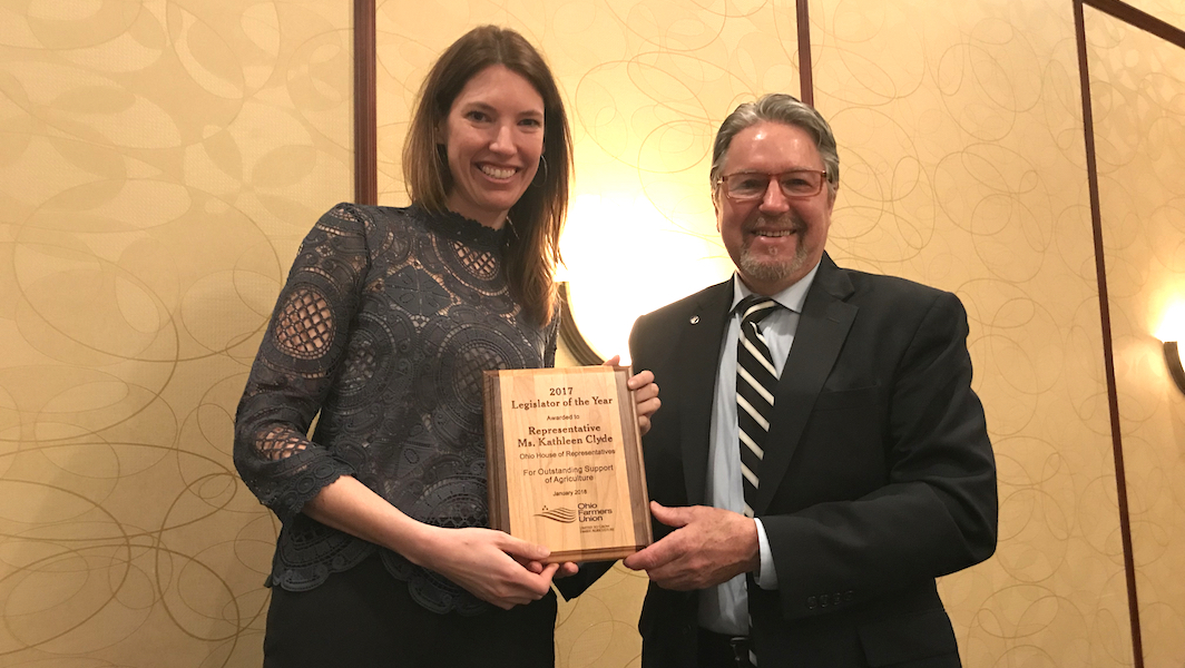 Ohio Rep. Kathleen Clyde, D-Kent, received legislator of the year honors from the Ohio Farmers Union, represented by president Joe Logan, during the annual convention Jan. 26-27 in Columbus.