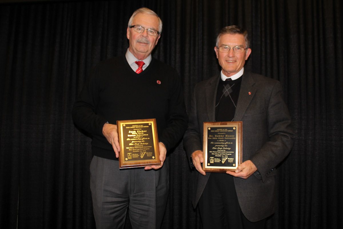 During the presentation of awards, Fisher, along with Bobby Moser, past dean of OSU’s College of Agriculture and Environmental Sciences, received the Friend of the Ohio Sheep Industry awards.