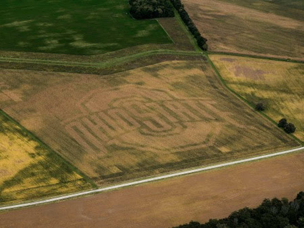 Fly a few hundred feet above the cornfield, and a clear image comes into view: a Block O with the words “Ohio State” angled through the middle of it.