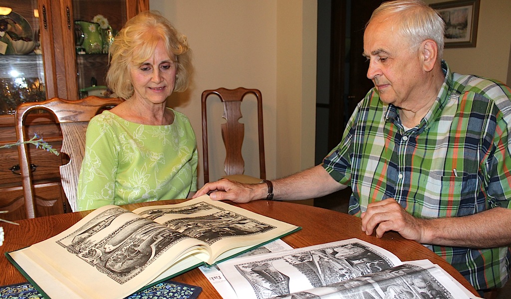 Gerry and Mike Klepek look over some historical photos that inspired Mike to visit all of Ohio's county fairs.