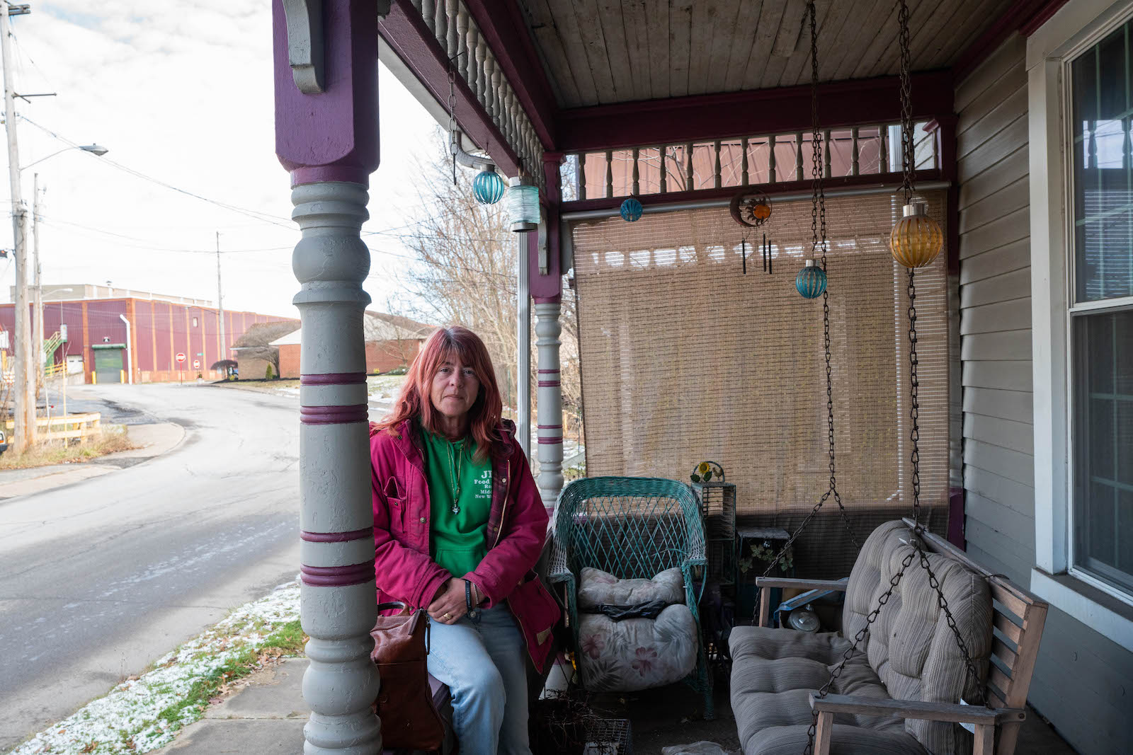 Krissy Ferguson sits on the railing of her front porch in East Palestine, Ohio on Dec. 20, 2023. (Liz Partsch photo)