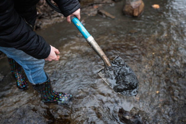 Standing in the creek in ankle-deep water, Siceloff plunges her shovel into the ground and moves the sediment around in the water. She does this repeatedly, pointing out the little trails of white milky sheen oozing out of the mud.