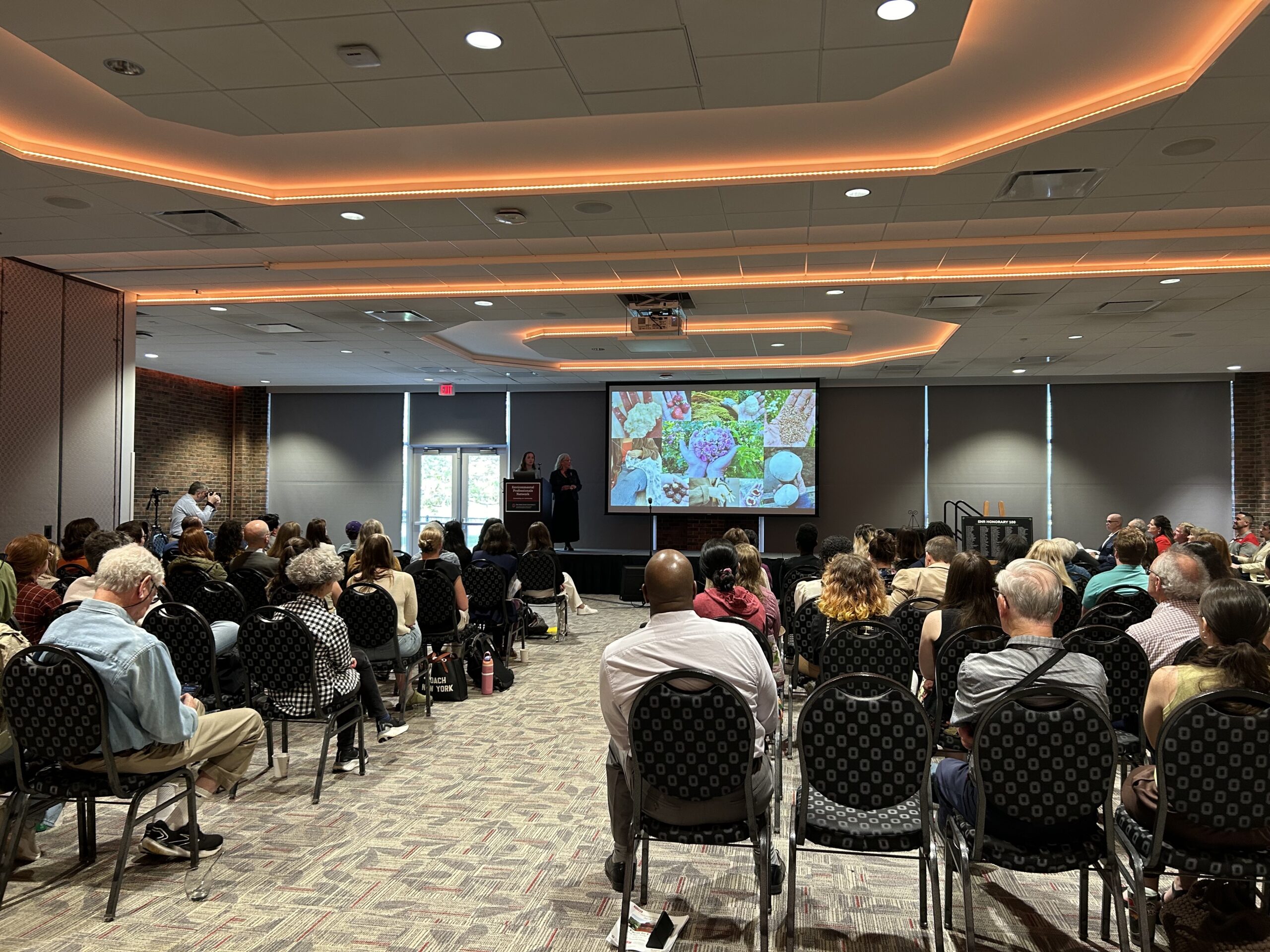 Sarah Pottle and twin sister Jess Boeke give a presentation about their business Rust Belt Fibershed at Ohio State University’s Farm to Fashion event on April 21, 2025. (Liz Partsch photo)
