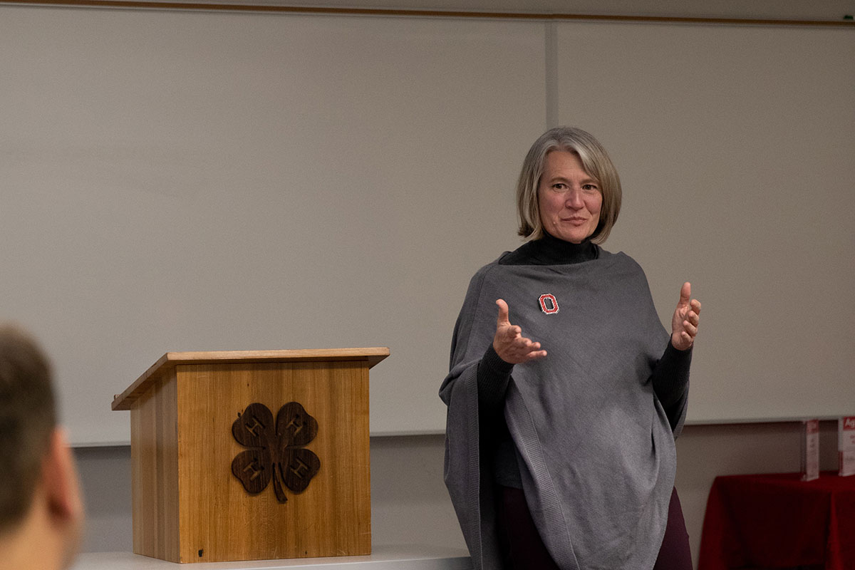 Cathann Kress, vice president of agricultural administration and dean of Ohio State University College of Food, Agricultural and Environmental Sciences, speaks to members of the AgOne cohort during the graduation ceremony. (Submitted photo)