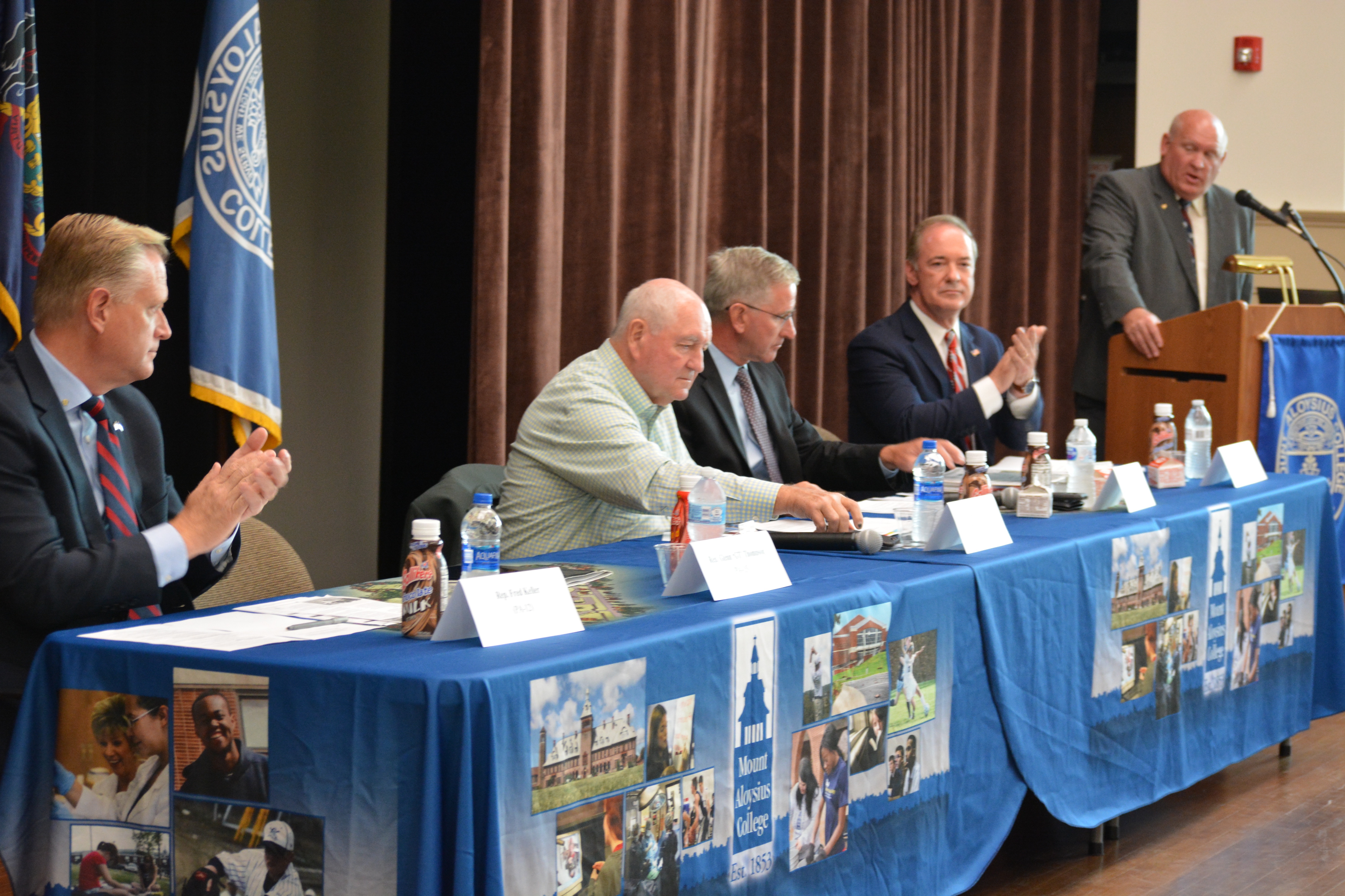 Federal, Pennsylvania and local officials listened to concerns from dairy farmers and advocates at a meeting, on Aug. 12, 2019, at Mount Aloysius College, in Cresson, Pennsylvania. Pictured, from left, are: U.S. Rep. Fred Keller; U.S. Secretary of Agriculture Sonny Perdue; Pennsylvania Secretary of Agriculture Russell Redding; U.S. Rep. John Joyce; and U.S. Rep. Glenn “GT” Thompson. (Rebecca Miller photo)