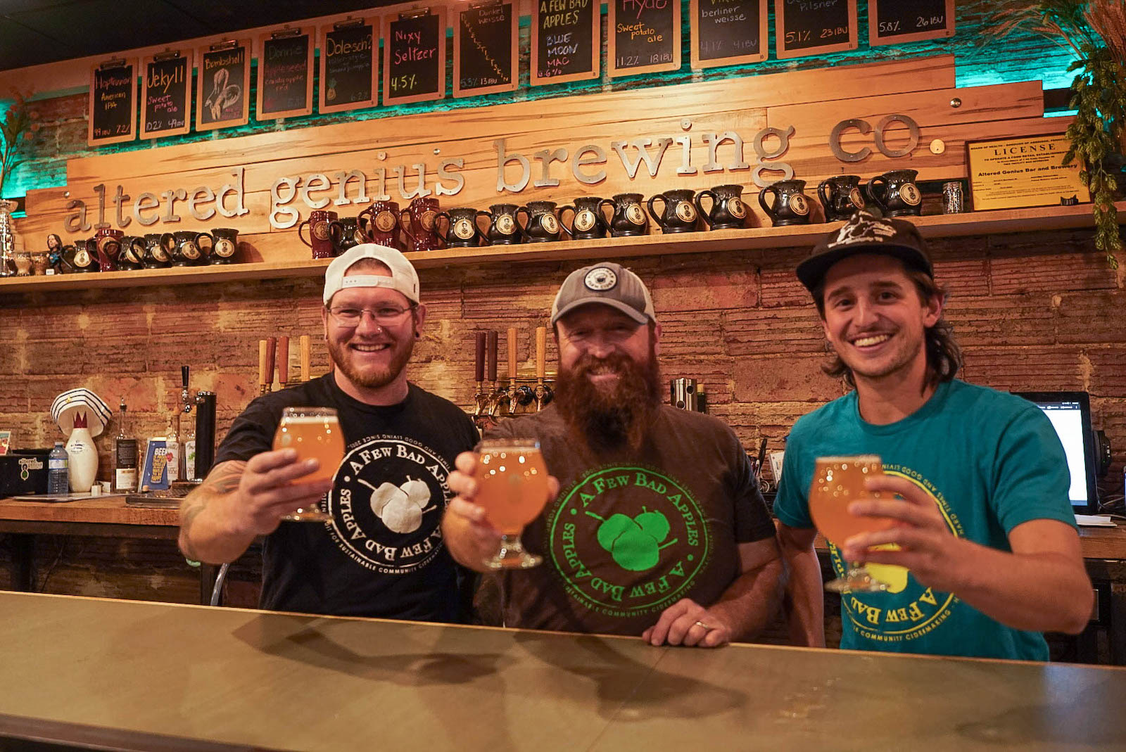 (From left to right) Jordon Miller, Mike Sturges and Patrick Ballow hold up A Few Bad Apples cider straight from the tap at Altered Genius Brewing Co. on Oct. 11, 2023. (Liz Partsch photo)