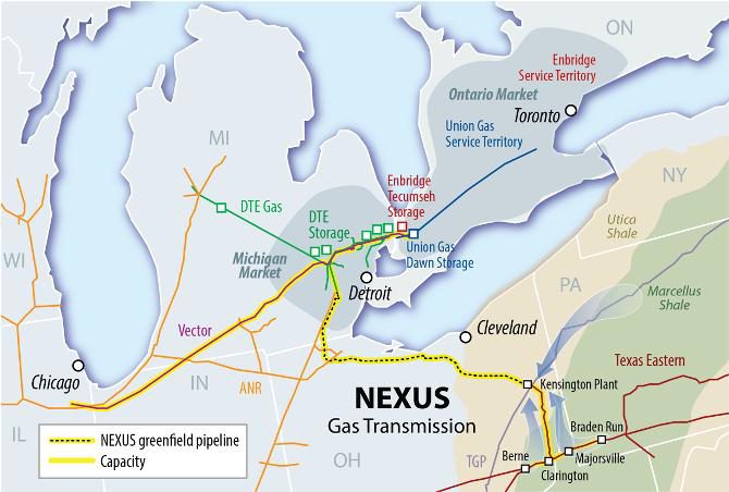 The Nexus Pipeline will move natural gas through northeastern Ohio, en route to Michigan and the Midwest, moving 1.5 billion cubic feet of gas per day. Barring final regulatory approval and construction, that line is expected to be in use by the end of 2017.