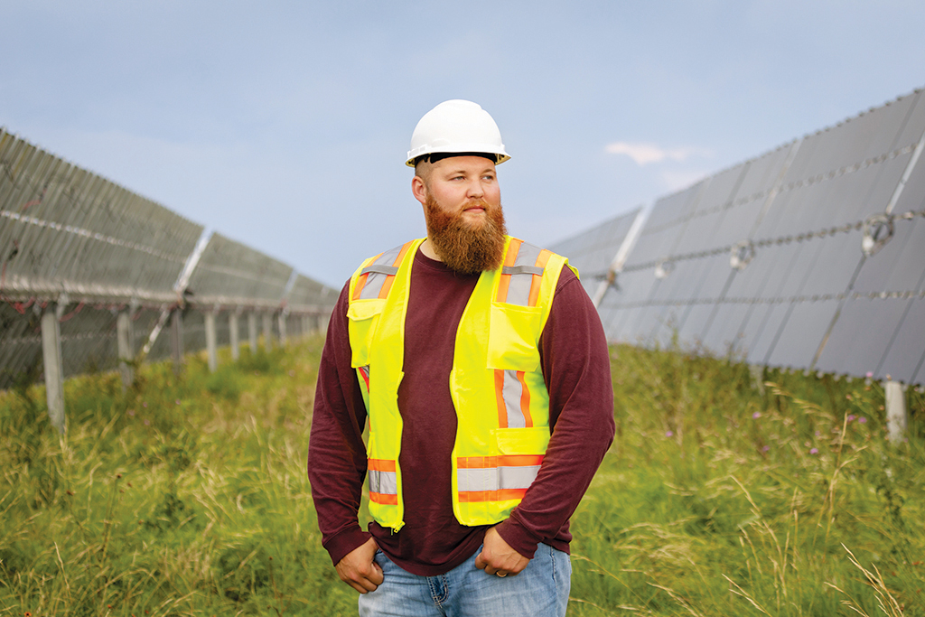 Camren Maierle, of New Slate Land Management, stands in front of a solar array. (Submitted photo)