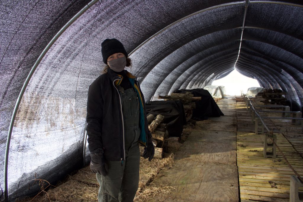 Sasha Miller, of Purplebrown Farmstead, stands under the shade cloth that covers the mushrooms at the farm, Feb. 11, in Boston Heights, Ohio. (Sarah Donaldson photo)