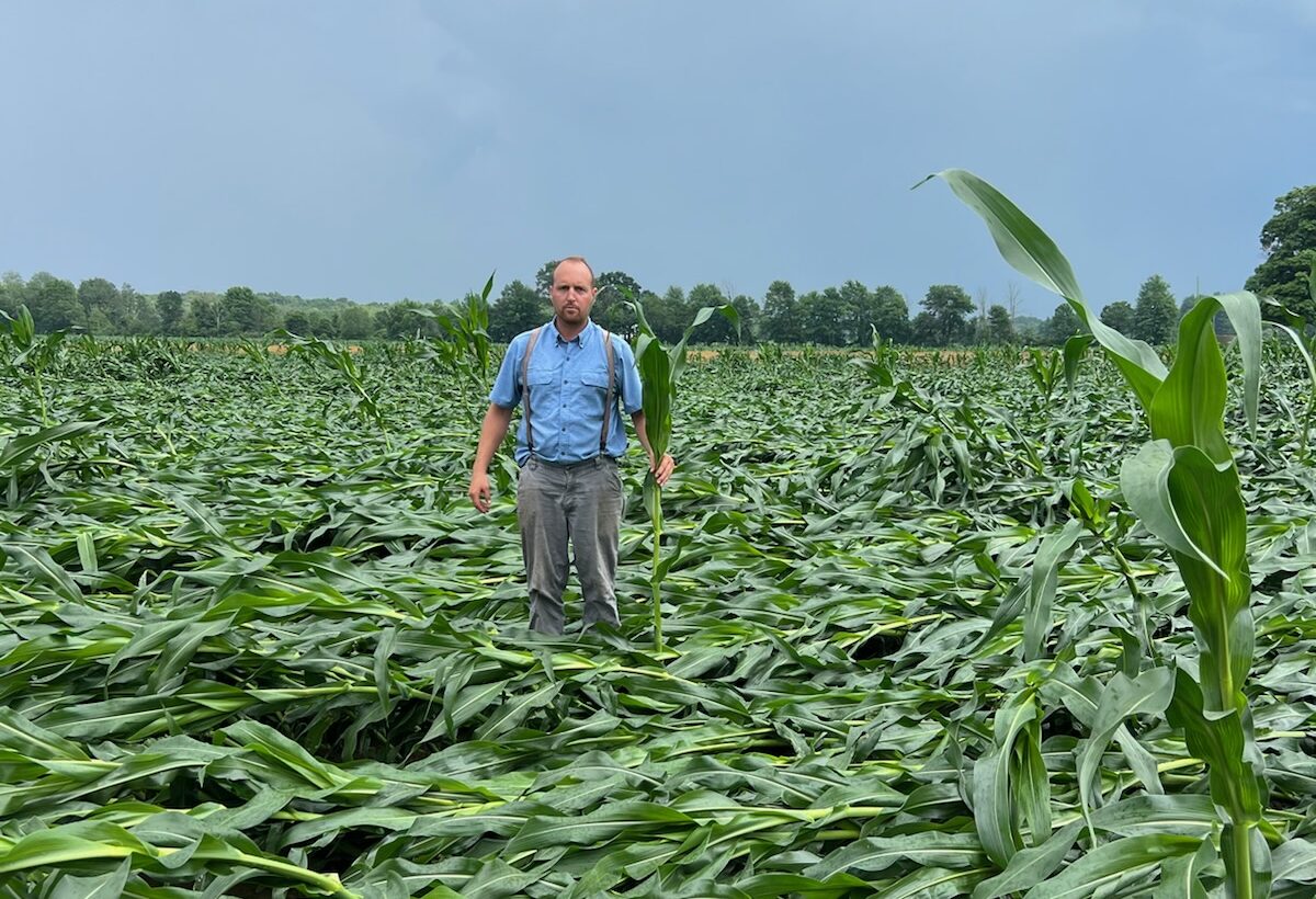 David Mast stands in his corn field July 6, near Jamestown, Pennsylvania, that was flattened by an isolated thunderstorm that dumped an inch of rain on the field plus high winds. (submitted)