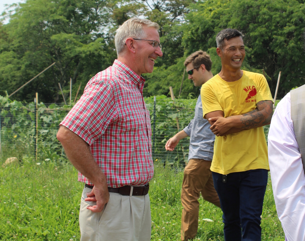 Pennsylvania Agriculture Secretary Russell Redding and urban farmer Rafael Vencio share a laugh during a tour of Hilltop Urban Farm, in Pittsburgh, Pennsylvania, July 20, 2021. (Rachel Wagoner photo)