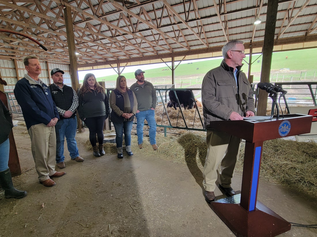Pennsylvania Agriculture Secretary Russell Redding speaks about the need for an animal diagnostic laboratory in western Pennsylvania during an event at Old English Acres Farm in Enon Valley, on April 4. Behind him stand the Clark family, who run Old English Acres, and State Sen. Elder Vogel, also a farmer and the chair of the Ag and Rural Affairs Committee. (Rachel Wagoner photo)