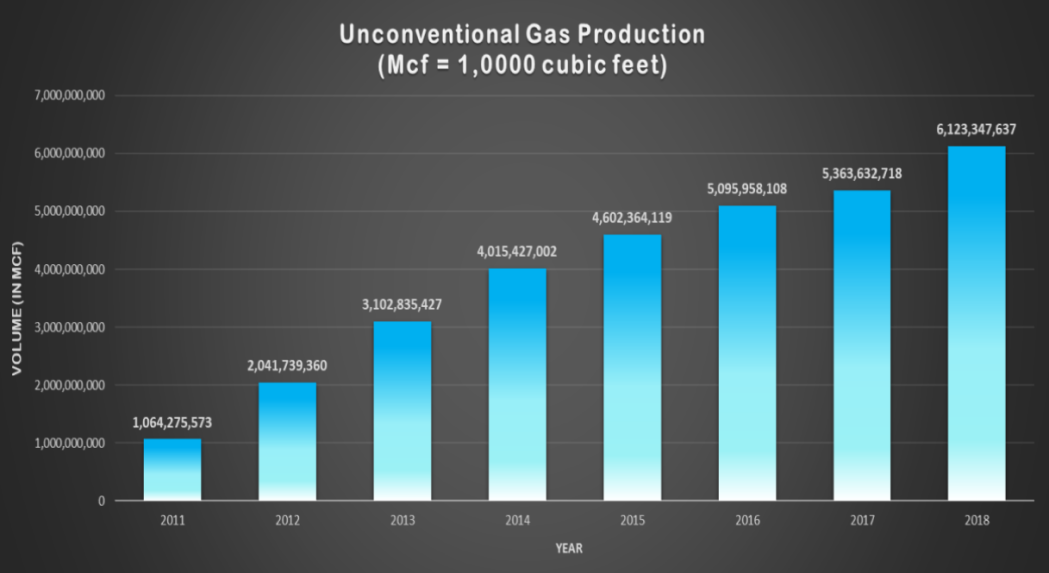 Unconventional well operators produced 6.1 trillion cubic feet of natural gas, an increase of .8 trillion cubic feet over 2017. That’s the largest volume of natural gas produced in Pennsylvania in a single year.