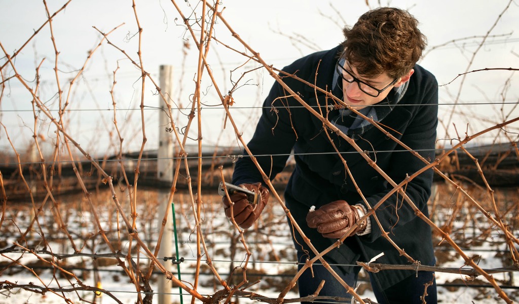 Al Kovaleski, a Cornell University doctoral student in the field of horticulture, inspects grape vines. Cornell research is using new technologies to explore the cellular mechanics that allow grape buds to survive brutal cold. (Photo courtesy Cornell University.)