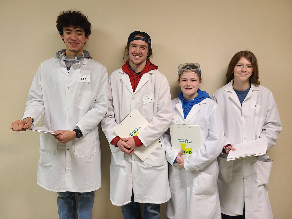 Four members of the Zane Trace FFA chapter traveled to the Greene County Fairgrounds Jan. 20 in Xenia to compete in the Ohio FFA Biotechnology Career Development Event. The team of Wyatt Vick, Sarah McGraw, Charley Clyne and Caitlin DiBenedetto placed ninth out of 20 teams that qualified for the state contest and earned a plaque for their efforts.