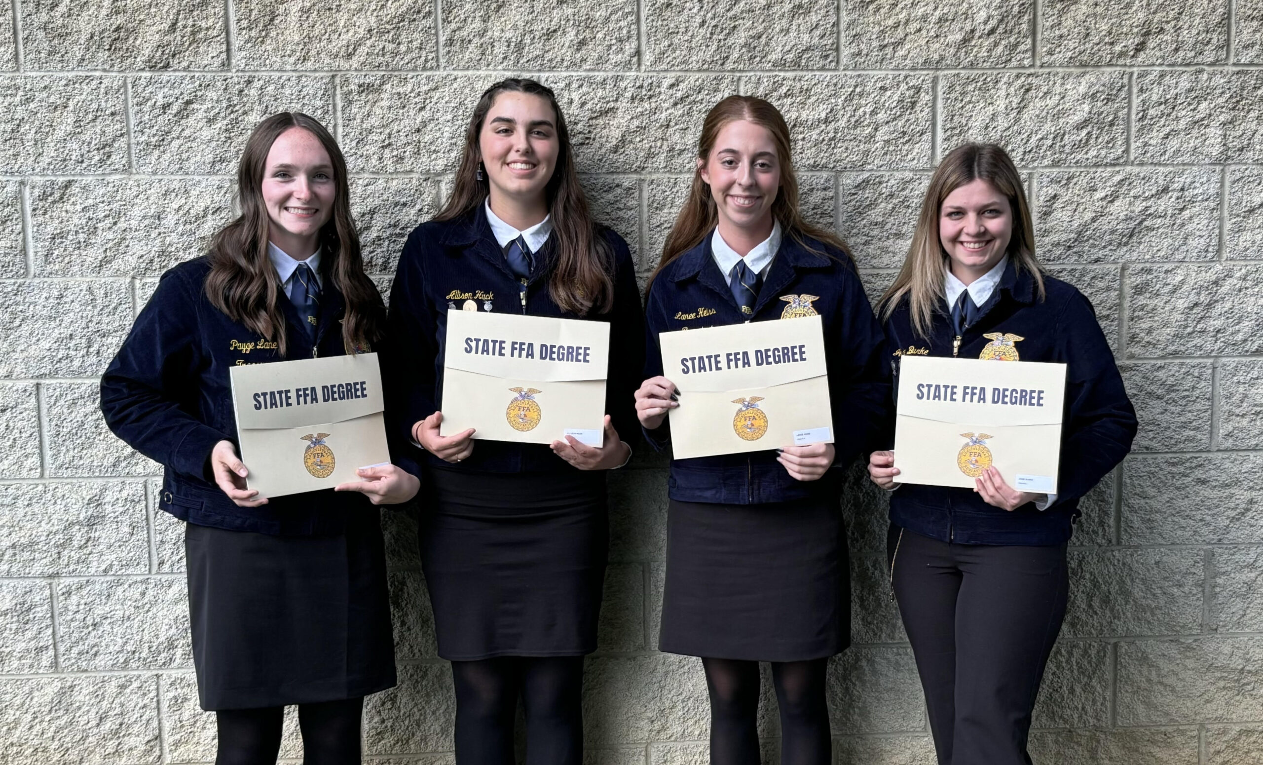 WATERFORD, Ohio — Waterford FFA members Josie Burke, Lanee Heiss, Allison Huck and Payge Lane were awarded their State FFA Degrees at the 96th Ohio State FFA Convention in Columbus. Each recipient received a gold State FFA Degree key and a certificate to commemorate the achievement.