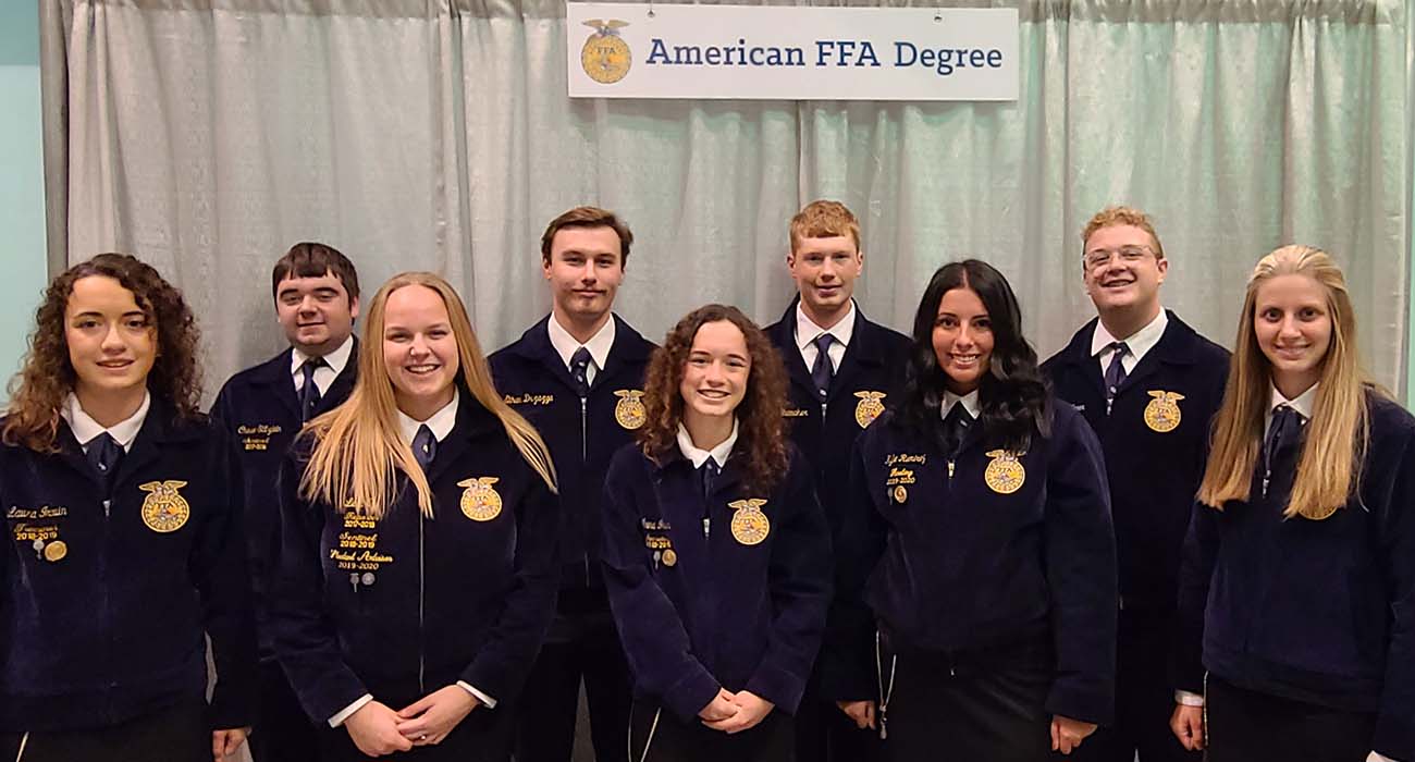 Nine West Holmes FFA graduates received their American FFA Degrees Oct. 30, including Ethan Drzazga, Macin Hager, Anna Irwin, Laura Irwin, Lexi Ogi, Kylie Ramirez, Brayden Shumaker, Tierra Slaubaugh and Chase Stitzlein. The chapter sent 16 members to the national convention in Indianapolis, Indiana, Oct. 26-30.