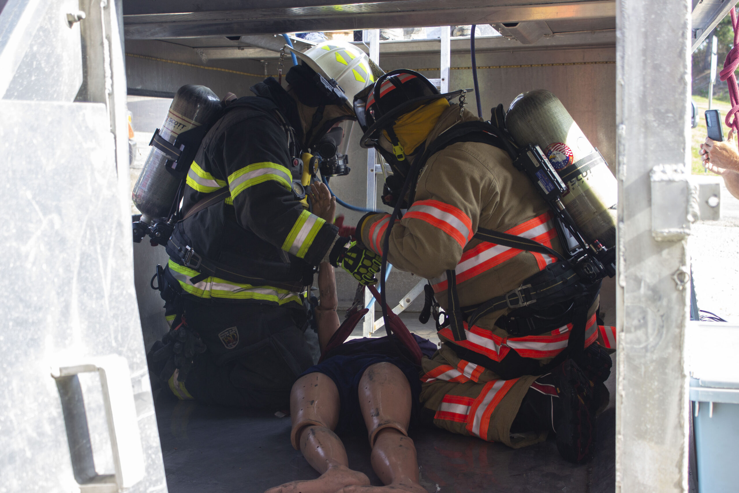 Suited up and wearing self-contained breathing apparatuses, the first two rescuers descended into the simulated confined space. To the uninitiated, it looks like a hollow trailer with windows for outside observers to watch the steps undertaken by first responders inside. Their objective was to assess and retrieve the victims, represented by mannequins. One rescuer was tasked with handling the child and called out gas readings. The other secured the adult with a half-body harness for extraction. Up above, another firefighter cranked a wench to pull the first victim out.