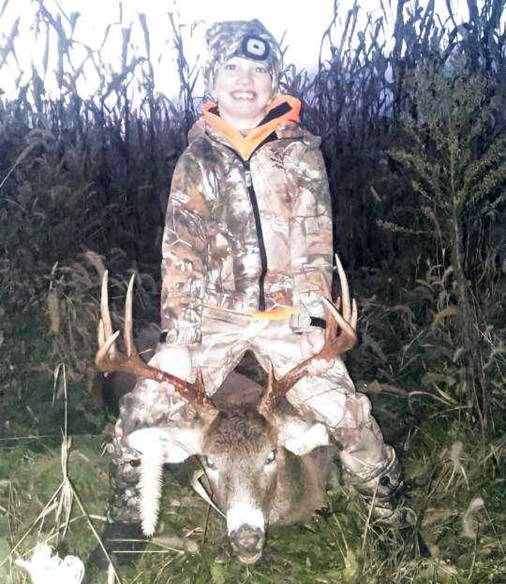 Eight-year-old Ryder Beight shot his first 11-point buck at 70 yards, hunting with his dad, Owen Beight, in Columbiana County, Ohio, on Oct. 30, 2020.