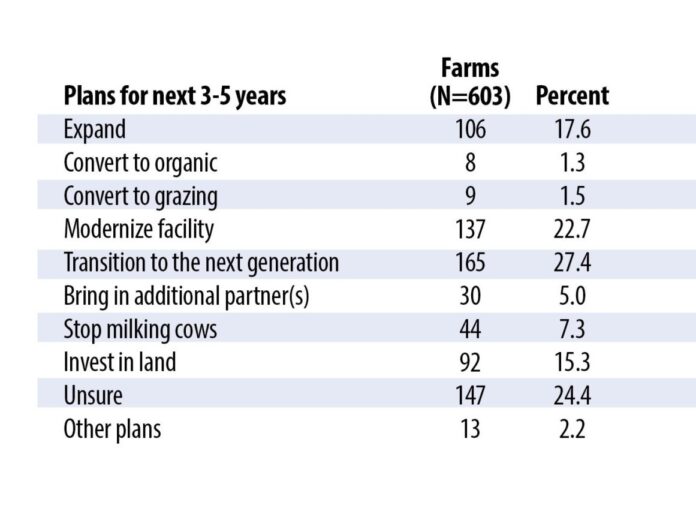 Some of the results indicate that many farmers are planning to retire, according to a summary of the survey results posted online. Twenty-seven percent of respondents said they were looking to transition out of the business and leave the farm to the next generation. Another 7% said they plan to stop milking cows in that same time frame.