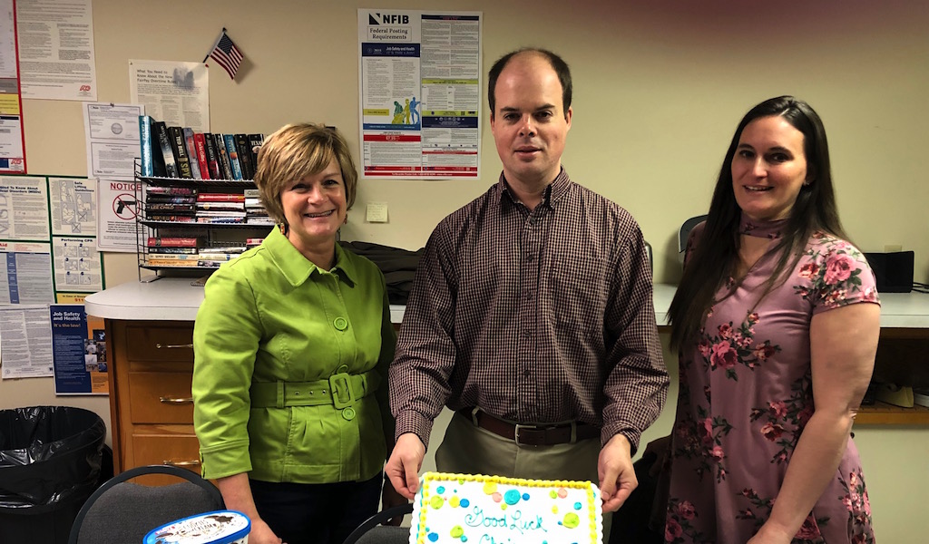Reporter Chris Kick is leaving Farm and Dairy after 10 years, for a new job at Iowa State University Extension. With him is editor, Susan Crowell (left), and copy editor, Aimee Tenzek.