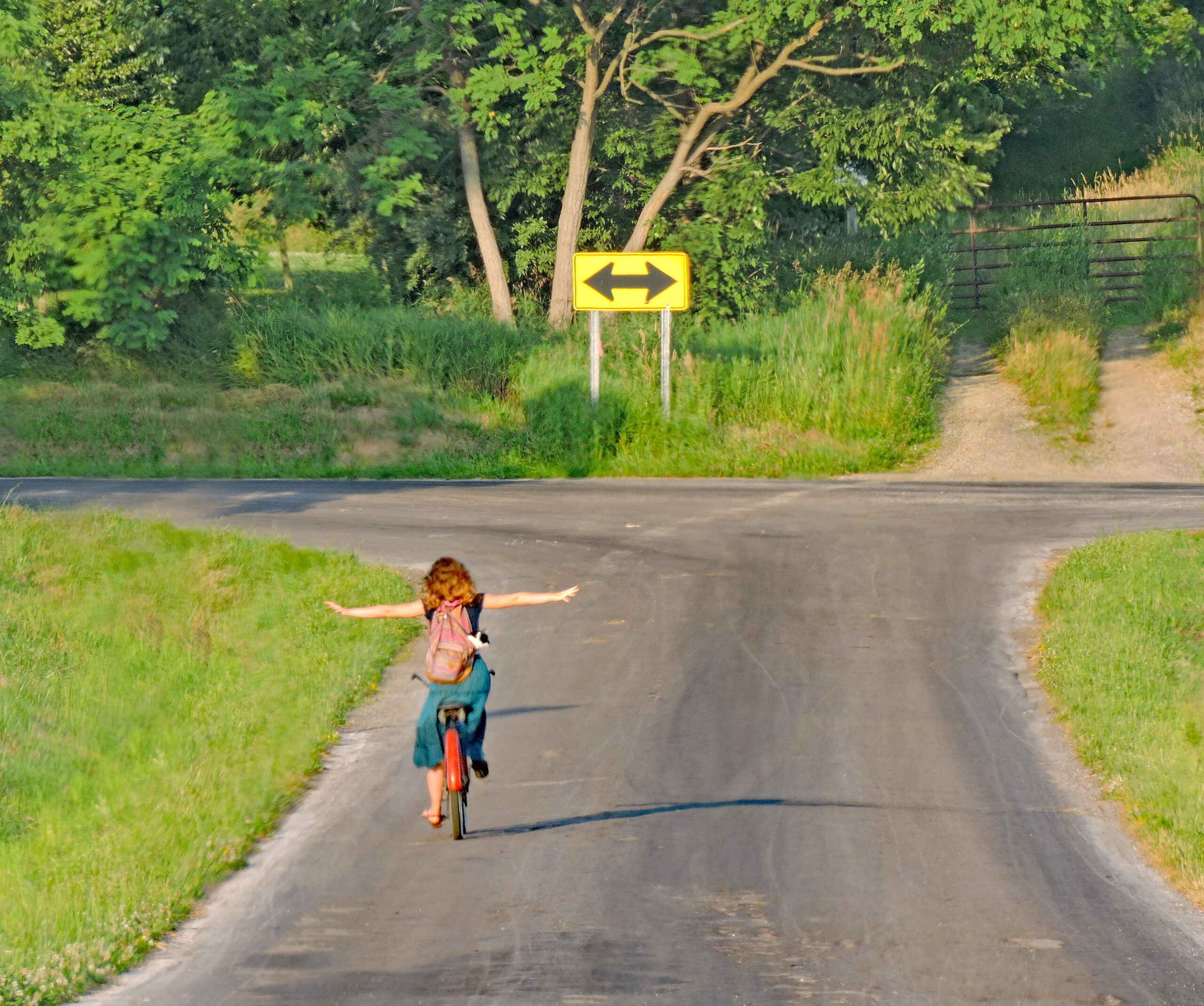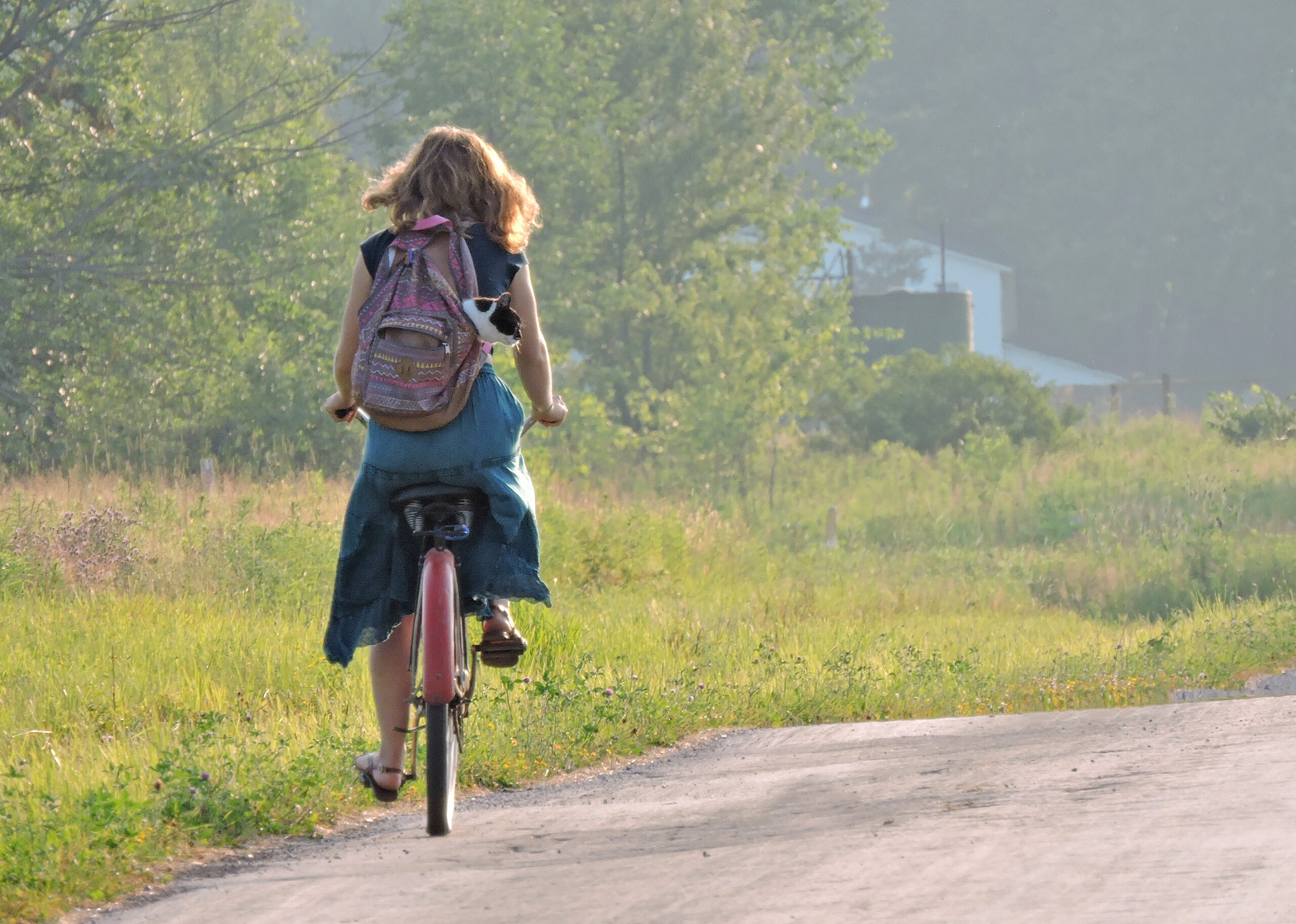 The saying “he felt like he died and went to heaven” is probably an understatement here. Felix went from being a lost soul to one constantly showered with love and affection, and he returned the favor tenfold. In fact, he blossomed under Grace’s care. Bicycling the beautiful backroads has always been one of Grace’s favorite ways to enjoy time alone, so it only made sense that Felix accompany her on these forays. Sensing the cat’s calmness and trust, she carefully placed him in a backpack, which she then slung over her shoulders. Together, the two of them traveled for miles, day after day, enjoying the countryside and reveling in each other’s company. Passersby did double-takes at the duo, as the black and white cat bounced happily along, surveying the terrain.