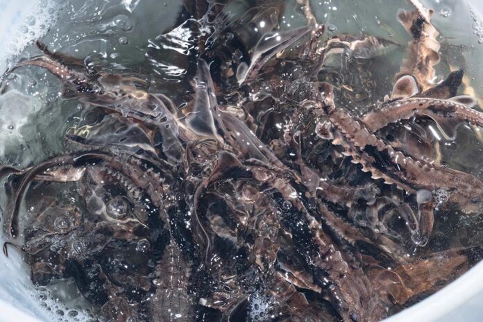 Juvenile sturgeon wriggle in a bucket before being released into the Cuyahoga River, on Oct. 4, 2025. (Matthew Chasney photo)