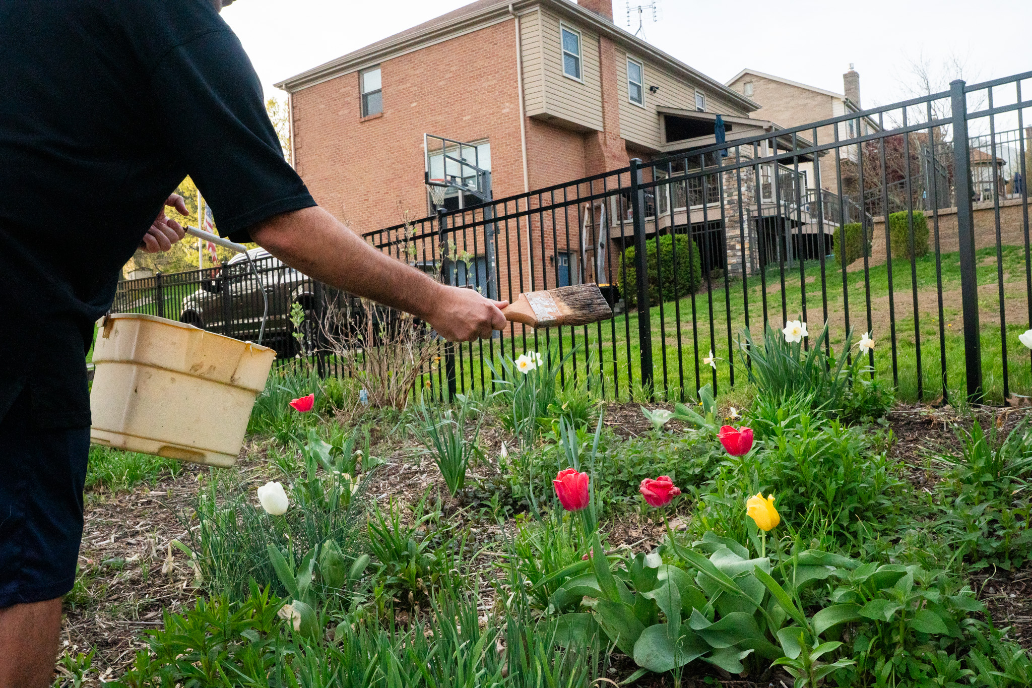 This mixture ultimately drives away garden-hungry animals like deer, rabbits and groundhogs. My dad applies the deer repellent, as needed, on anything animals may want to eat, from tulips, hostas and lilies to pepper plants, and even crops on days when he finds the groundhogs lurking around in his garden… again!
