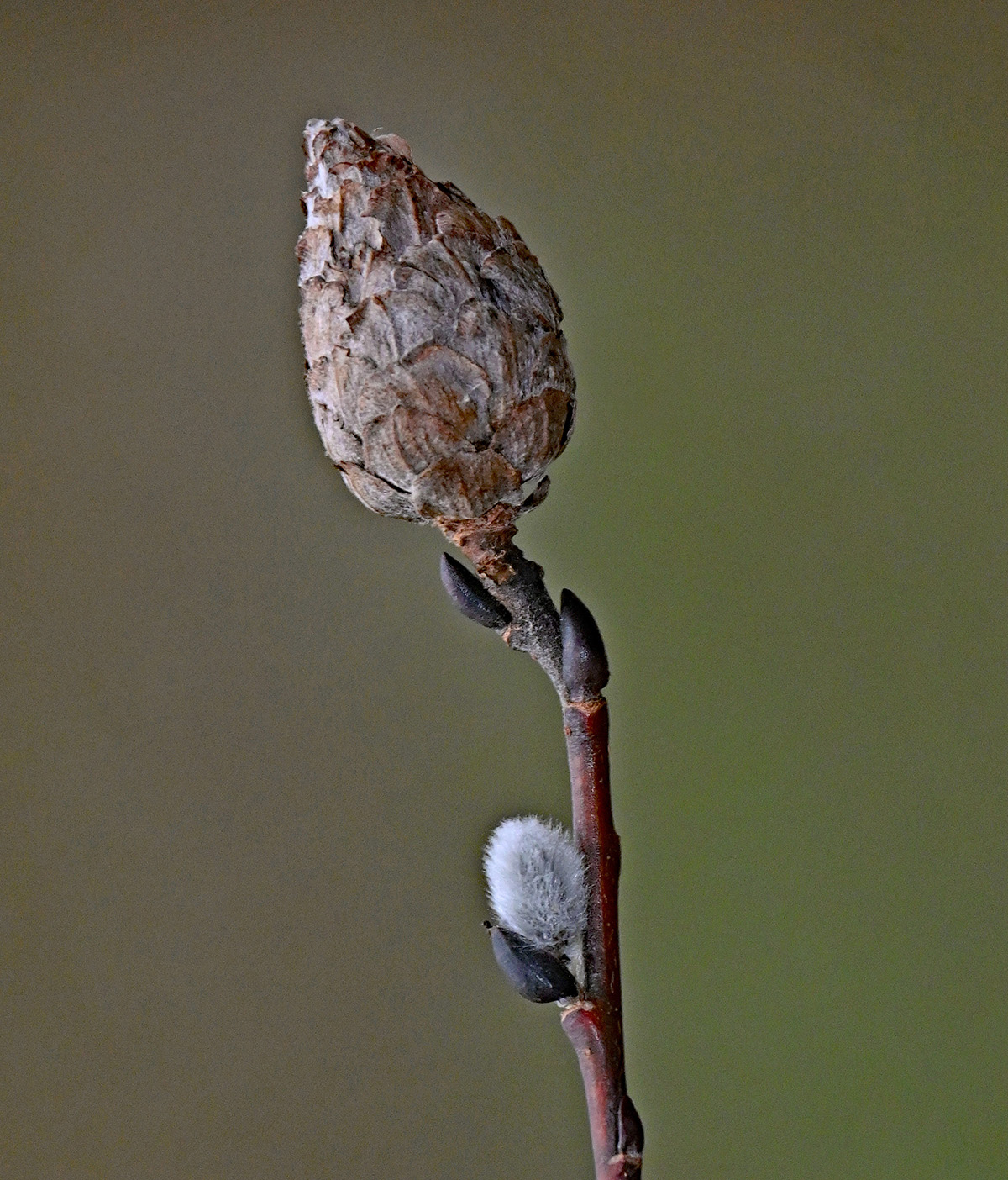 One species particularly dependent upon willows is the pinecone willow gall midge. This tiny gall wasp is responsible for creating the small brown structures that adorn the tips of many willow branches. A gall is an abnormal growth found on a plant, caused by the eating or egg-laying activity of an insect. When a gall wasp deposits an egg, it injects hormones that aid in the creation of the gall structure by altering the leaf’s typical growth pattern. Slowly, the affected area begins to grow, aberrantly, around the egg, getting larger as the plant matures. The size and shape of the gall is indicative of the species that created it. It just so happens that the galls found at the tips of willow branches grow in such a way as to resemble pinecones. Inside of each gall, a tiny larva overwinters and emerges in the spring as a winged adult. These insects do no harm to the plant and often provide food for birds which peck their way into the structures during the winter for the fatty grubs within.