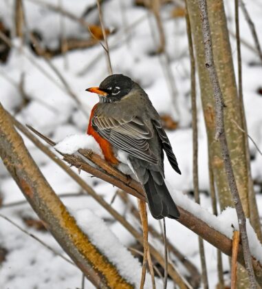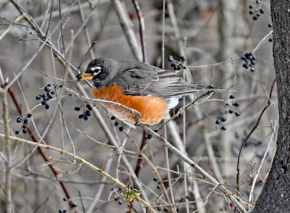 American robins used to be strictly migratory, departing for southern climes in the autumn and appearing back on their breeding grounds first thing in the spring. But the change in the climate, resulting in much milder winters, has resulted in a portion of the population remaining as year-round residents. Robins are big fruit and berry eaters, so as long as there are sufficient food supplies to sustain them throughout the colder months, they stand to gain the advantage of claiming the best nest sites for themselves before the migratory generation returns. Sadly, freak ice storms that encase their food, or severe, bitter snowstorms, may wipe out large flocks of robins as they frantically search for ways to stay alive.
