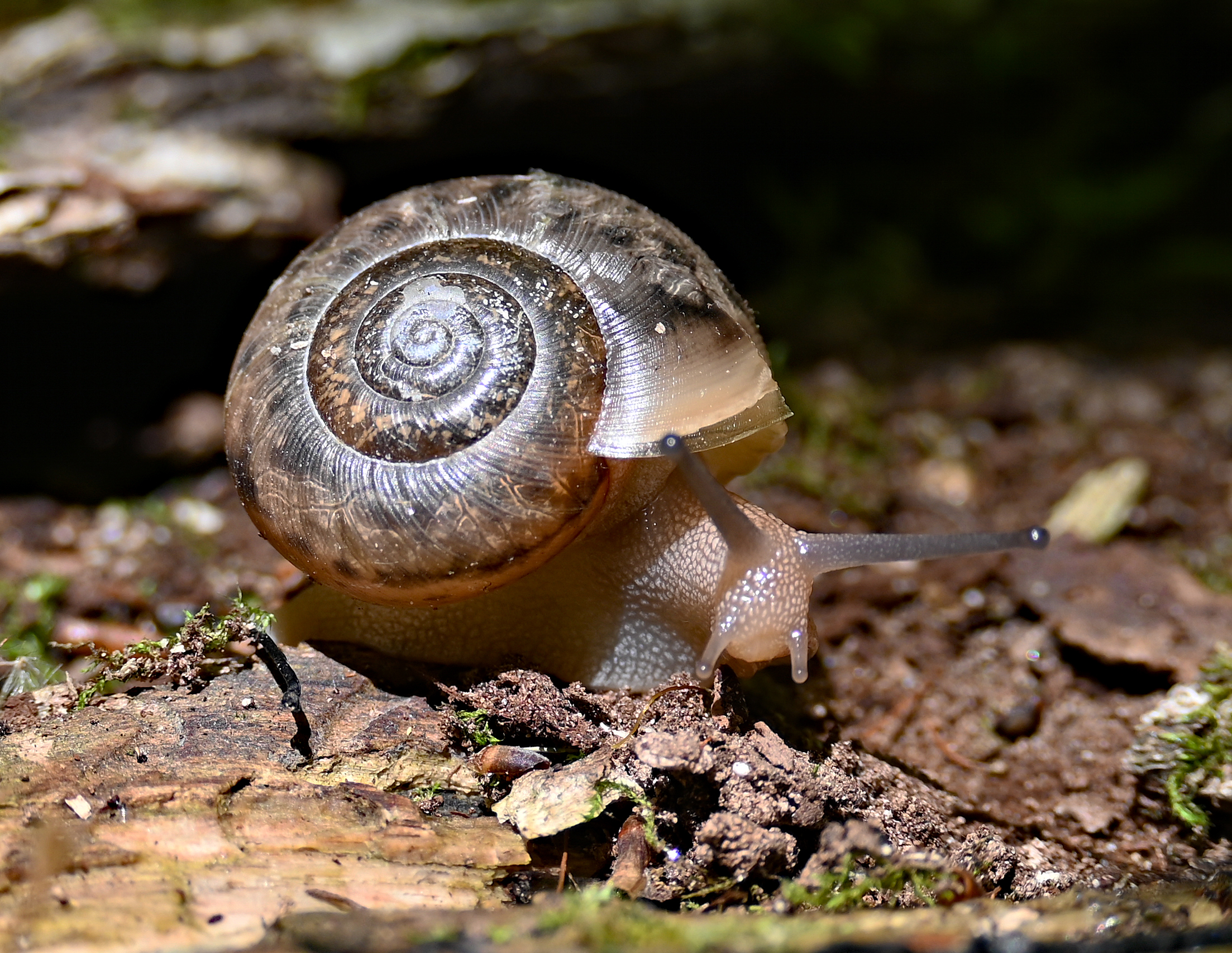 Snails are most easily identified by their external shell which they carry around on their backs. This spiral structure offers the snails protection, as they retract inside to escape predators. Snails are found throughout a variety of habitats and environments.