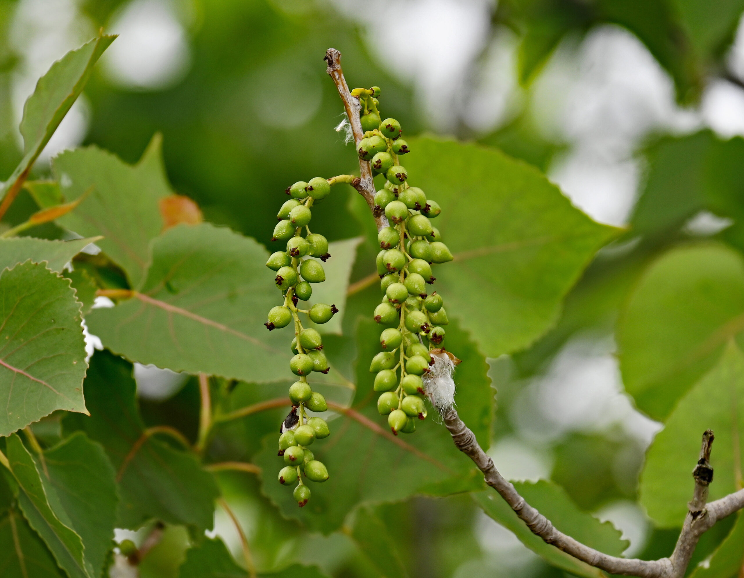The flowers of both bloom before the leaves appear and once pollinated, the female flowers begin to develop into long strands of round, green capsules resembling a string of beads, giving the species the nickname “necklace poplar.”