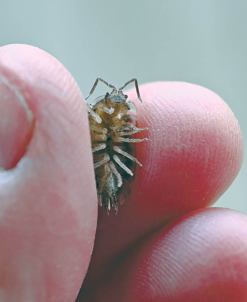 It wasn’t until years later, as my interest in arthropods deepened, that I came to realize that sowbugs and pill bugs belonged to different families. Pill bugs (family Armadilidiidae) and sowbugs (family Porcellionidae), although closely related, do have some differences. Pill bugs have the ability to roll up into a tight ball, like a little pill, a behavior that has earned them the name roly-polies. Coiling up in this manner not only protects them from predators but helps them retain moisture so important for their survival. Sowbugs, a bit larger than pill bugs, can be recognized by two small tail appendages that extend beyond the final segment of their body. Unlike pill bugs, they are unable to roll up their bodies for protection.