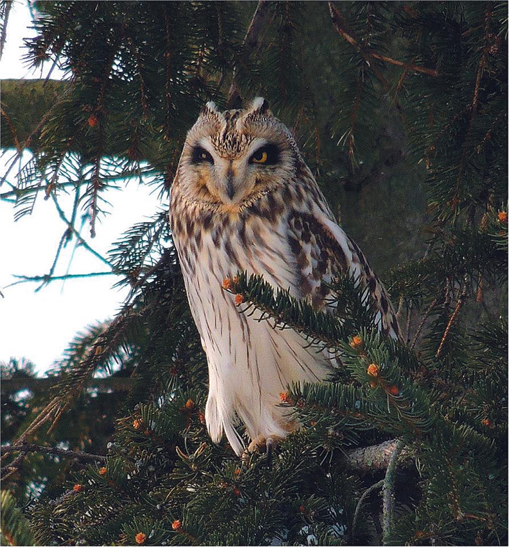 A short-eared owl rests in an evergreen by day in Middlefield, Ohio. (Tami Gingrich photo)
