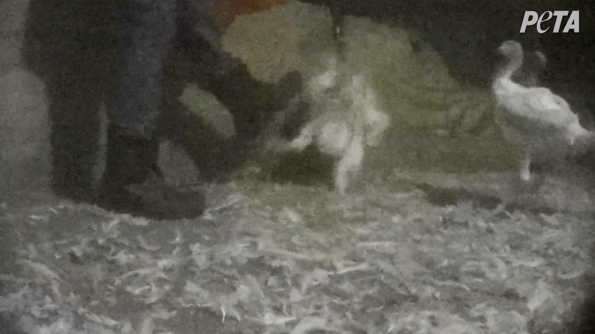 A still taken from a video released by PETA in August 2021 allegedly shows a worker kicking a turkey at a Plainville Farms site in Pennsyvlania.