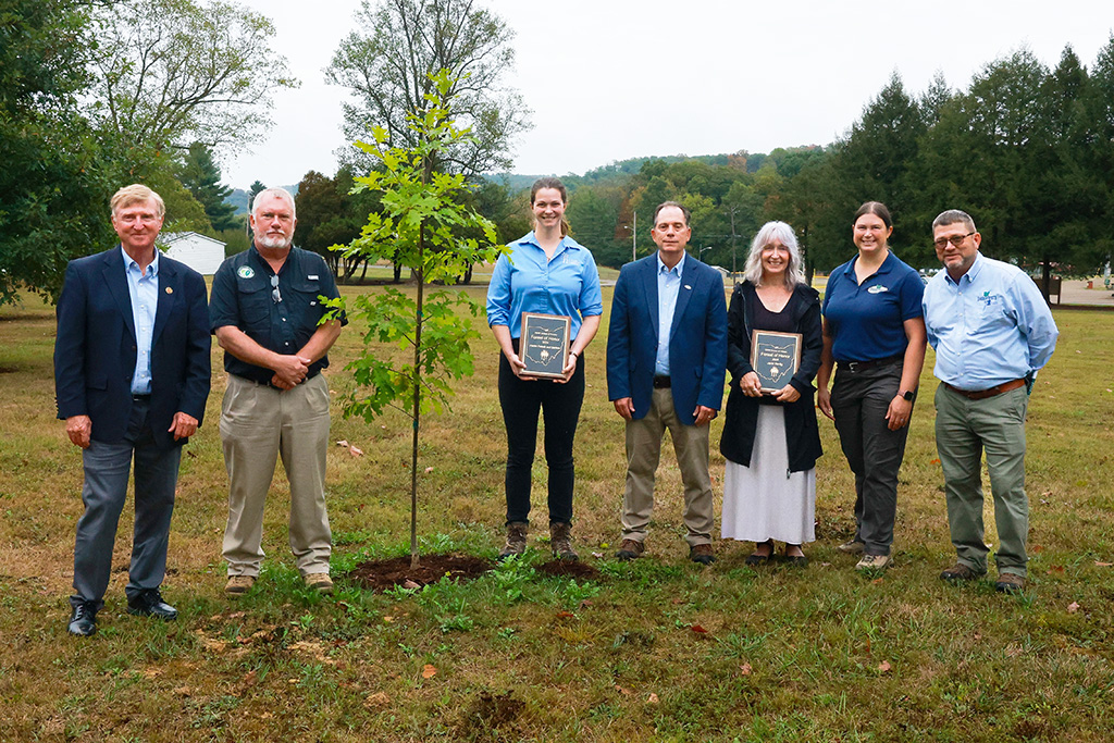 The ODNR Division of Forestry honored the 2024 Forest of Honor inductees at a tree planting ceremony in Zaleski State Forest on Sept. 26. Pictured, from left: Steve Gray, Assistant Director of the Ohio Department of Natural Resources; John Kehn, DOF Northern Ohio District Service Forestry Manager; Jessica Miller Mecaskey, Holden Forests & Gardens; Dan Balser, Chief ODNR Division of Forestry; Jarel Bartig, Ohio Interagency Liasion; Stephanie Downs, DOF Private Lands Administrator; Dave Apsley, DOF Landowner Outreach. (Submitted photo)