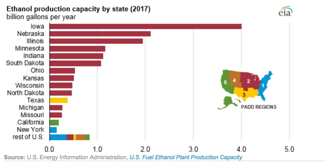 The top three states — Iowa, Nebraska, and Illinois — contain more than half of the nation’s total ethanol production capacity.