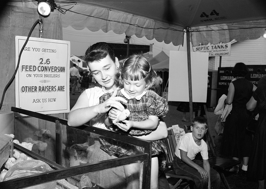 Thursday, Sept. 16, 1954: Among the interesting things at the fair are little chicks, and Mrs. Charles Ellen lifts Bethy Jo Plant, 4, up where she can hold one. Bethy Joe is a daughter of Mr and Mrs. Wesley Plant, of Shreve. (Daily Record photo, courtesy of The Wayne County Public Library)