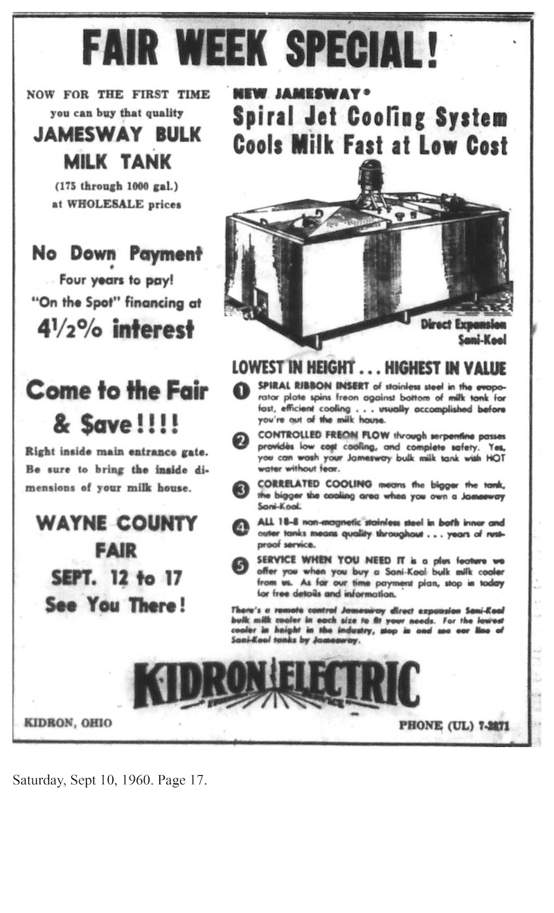 Not all prices quoted as fair week specials have increased exponentially. In 1977, Kidron Electric advertised “Amana goes to the fair; Savings for everyone” with the examples of a Radarange microwave oven “now only $499” that came free with an Amana Country Cooker stoneware dish that was called a $12.95 value.