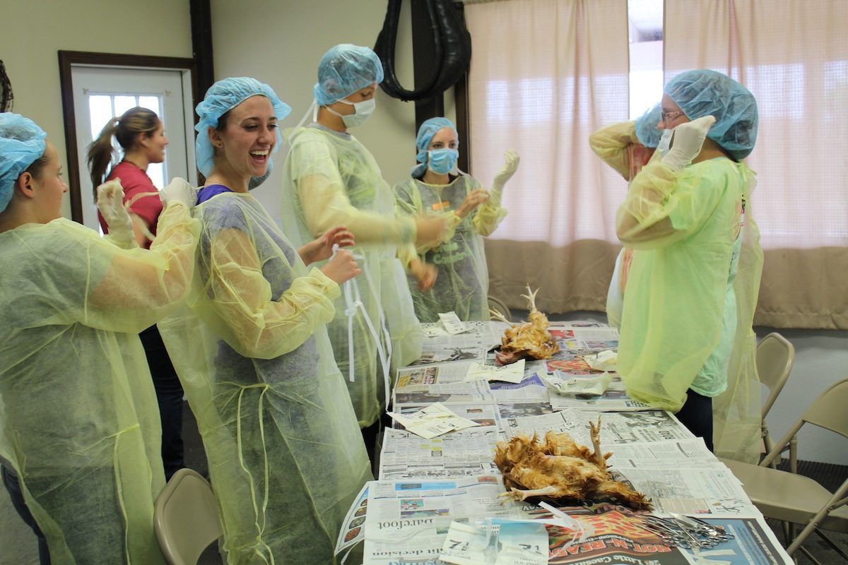 With The Birdie Song playing in the background, they put on surgery gloves, hats, aprons and face masks, and dissected whole chickens. Instructors from the clinic led the dissection, explaining each part of the bird and its function. At the end, students were permitted to dissect additional parts.