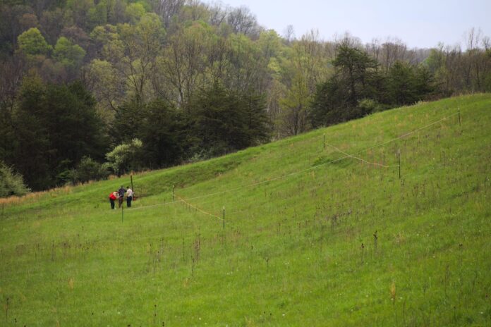 The Wayne National Forest announced April 21 that it is monitoring the Timbre Ridge Dam in Lawrence County, Ohio after recent heavy rainfall created a slump on the face of the dam. The stakes with cord between them denote the location of the slump on the face of the dam. (Wayne National Forest photo)