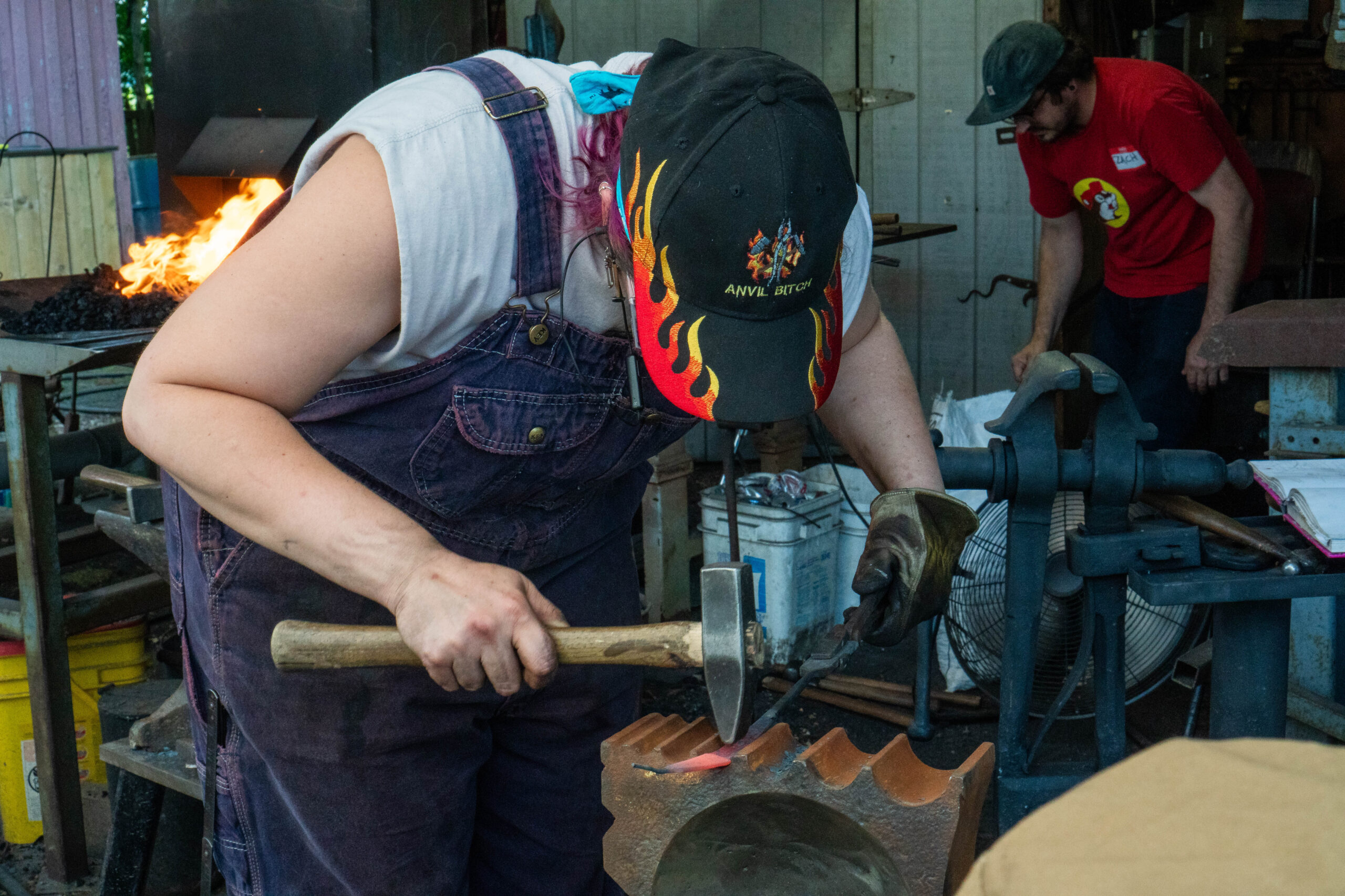 Anna Koplik hits hot metal to make a spatula at the Western Reserve Artist Blacksmith Association annual conference on June 28, 2025. (Liz Partsch photo)