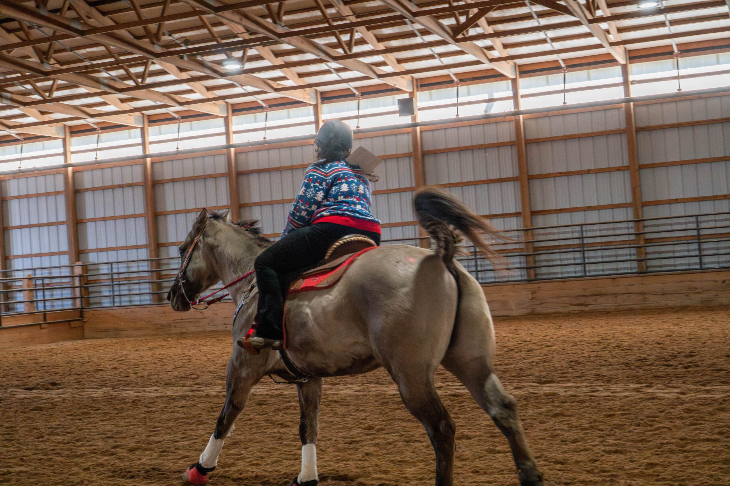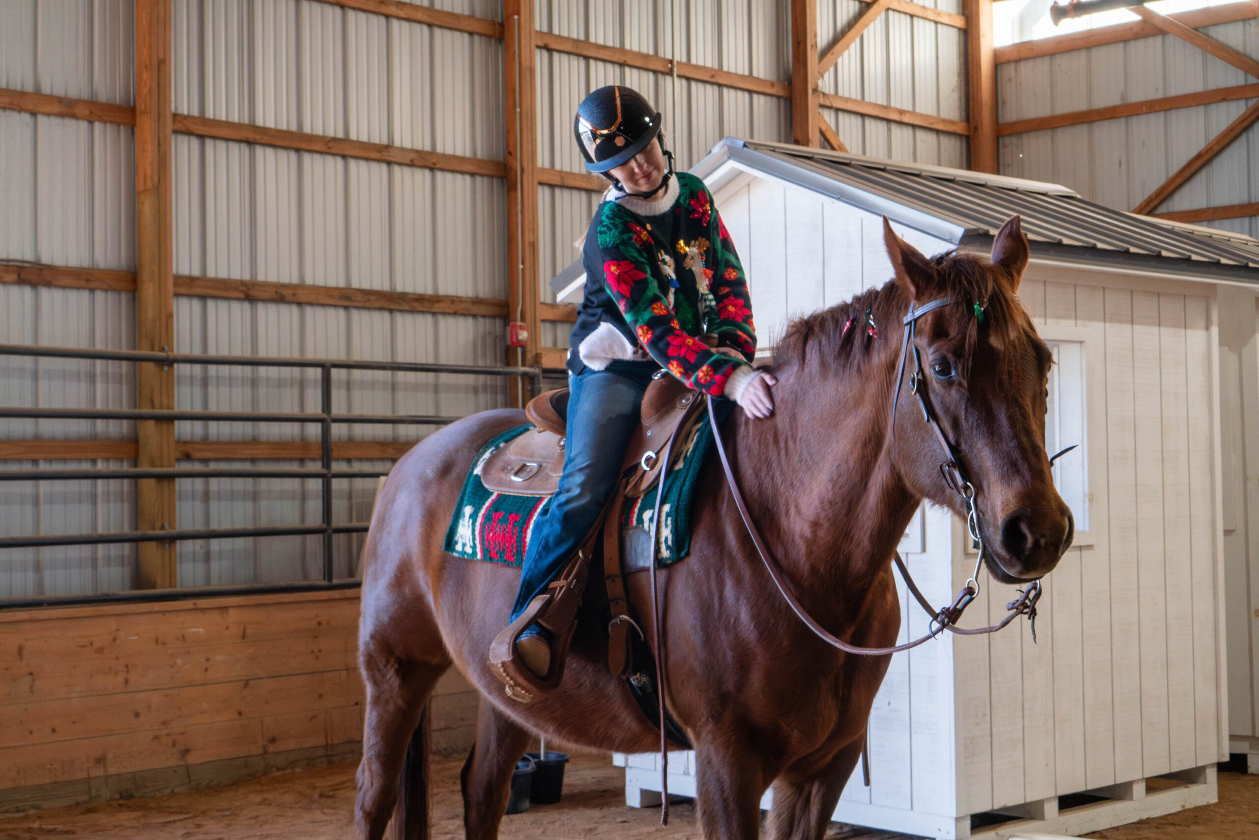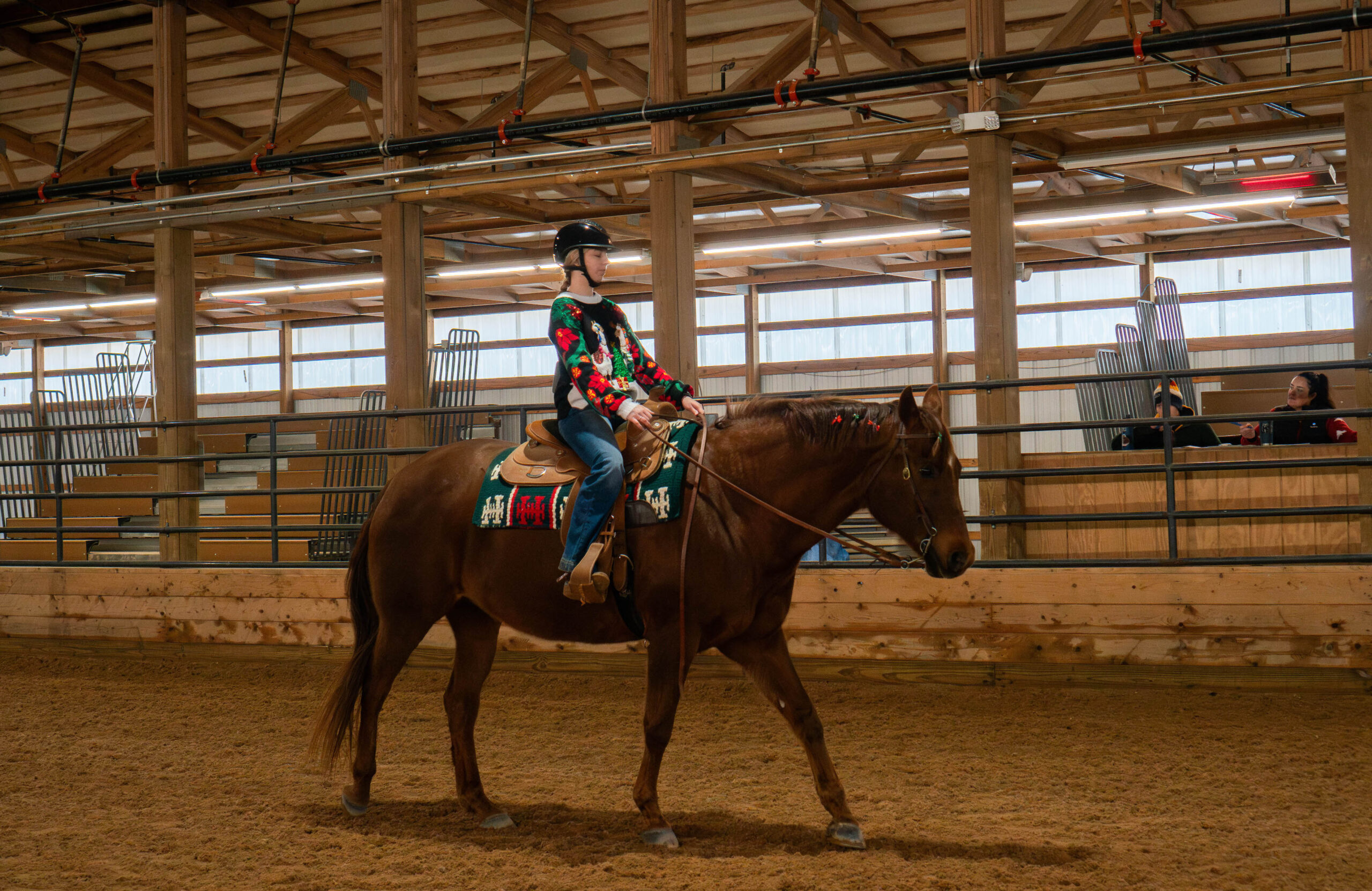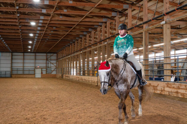 At the show this year, riders sported ugly Christmas sweaters with llamas and cows on them. The horses also wore festive attire, including Santa hats, reindeer antlers and red and green bows braided in their hair.